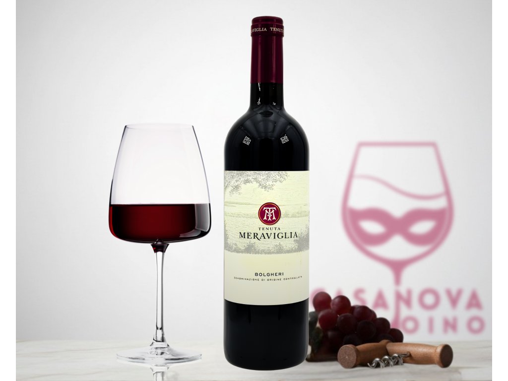 Vinařství Meraviglia, jež je relativně novou hvězdou na toskánském pobřeží v Bolgheri, se rychle zařadilo mezi respektované producenty této prestižní zóny, proslulé svými "super toskánskými" víny – vinařství těží z výjimečného terroiru Bolgheri s bohatými jílovitými a písčitými půdami, které jsou ideální pro pěstování mezinárodních odrůd a které se nachází v blízkosti moře, což dodává vínům unikátní slanou mineralitu – představuje své Bolgheri Rosso D.O.C. 2019, což je klasické cuvée Bolgheri, v němž se obvykle snoubí elegance Merlotu (pro jemnost) s pevnou strukturou Cabernet Sauvignonu (případně dalších odrůd jako Cabernet Franc či Sangiovese) – toto víno, které zrálo ve francouzských dubových sudech pro dosažení plné komplexnosti a dlouhověkosti, nabízí hlubokou, intenzivní rubínovou barvu a otevírá se bohatým a vrstevnatým aroma černého rybízu, zralých třešní, tabáku, lékořice, eukalyptu a jemného, toastového dřeva – na patře je plné, koncentrované a sametové s pevnou, ale dokonale zralou tříslovinou, která slibuje skvělý potenciál zrání, a dlouhým, elegantním závěrem – je absolutně ideální k opulentním masitým pokrmům, jako je Bistecca alla Fiorentina (pravý toskánský steak), Pečená hovězí žebra, Jehněčí pečeně s rozmarýnem nebo k bohatým Těstovinám s ragú z divočáka a k vyzrálým sýrům (Pecorino Toscano Stagionato), kde jeho struktura a intenzita dokonale podtrhne chuť jídla.